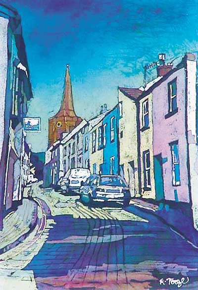Batik, a method of patterning cloth with wax and dye, goes back thousands of years. The earliest remnants of wax-resist cloth found in China were dated from AD581-618 and Japanese batik screens were dated from AD710-794. The practice spread from Asia to the Malayan archipelago and then to the Middle East via the caravan route. When Dutch colonisers brought batik cloth to Europe it started a wave of interest in the West with art schools in Europe and the USA exploring the technique and producing textiles for use and wear. This interest reached a peak in the 1920s and again in the 1960s. Batik as a fine art form started at that time in the West and spread worldwide, including back to countries like Java best known for continuing traditional production for use as head and body wraps, saris, carrying cloths and bags, household textiles and religious and ceremonial garments. Contemporary batik art uses the same basic techniques as the traditional makers but with variations: molten wax is applied with a tool to areas of cloth, cold dye is applied to the cloth by brushing or dipping and the dye will 'take' on the unwaxed areas and 'resist' the waxed parts. Boiling or ironing the cloth will remove the wax and reveal the image, with successive applications of wax and dye refining it and adding complexity of detail and texture. Many different fabrics may be used and wax may be applied with a variety of tools including the traditional 'canting' (a kind of pen with a reservoir for molten wax) or 'cap' (a copper stamp for repeating patterns). The Batik Guild, formed in 1986 in London to promote batik as an accessible creative art process, quickly grew and by the mid-90s had forged international links through conferences and exhibitions. To celebrate its 20th anniversary, the guild presented a comprehensive exhibition, showcasing the best contemporary work along with a selection of traditional batiks to provide the historical perspective, touring to six venues throughout England in 2006-7. Representing the Welsh area of the guild, four members have brought a selection of their original work to Tenby's Art Matters Gallery this month. Rhona Tooze, an artist and teacher from Swansea, who has taught batik throughout South Wales to all ages over the years and now teaches adults for Swansea University, came especially to Tenby for inspiration. She has produced a series of street scenes, strong painterly work with delicate detail and subtle colour variations. Another large piece, depicting a predominantly masculine sport in this predominantly feminine craft, features action from the Grand Slam, Wales versus England rugby, and a smaller work shows surfers. Pom Stanley, an artist and art therapist from North Wales, with wide teaching experience related to textile production and embellishment, brings painterly images of Celtic musicians, flautists and fiddlers playing in Welsh and Irish bars. The work begins in the social atmosphere, a very lively place to sketch in contrast to the quieter more solitary space of the studio where the work is completed. Wendy Evans, of St. Dogmaels, exhibits widely in Wales and tutors batik workshops in schools, colleges and community groups. Wendy's inspiration is drawn from her surroundings, especially the hills of Preseli, Carn Llidi and the county's distinctive landscape. Dorothy Morris, area representative for the guild and tutor of the medium, shows both figurative and abstract work as well as quilts, hangings, bags and some quirky 3D pieces. In 2002, she won second place in Tenby Art Festival's competition with work based on Pembroke. Together the four artists have produced a hugely varied exhibition showing both the versatility of the medium as well as their personal artistic skill: framed 'paintings', wall hangings, 3D and practical textiles will be shown, and some reproductions and cards will also be available. The Welsh Batik Guild: Selected Work exhibition starts tomorrow (Saturday) at Art Matters Gallery in South Parade, Tenby (next to the Fire Station). Readers are invited to meet the artists tomorrow afternoon from 2 to 4 pm when there will be a demonstration of batik techniques. The gallery is open from 10 am to 5 pm everyday except Wednesday, and everyone is welcome. For further information telephone (01834) 843375 or view the exhibition on the website http://www.artmatters.org.uk">www.artmatters.org.uk.