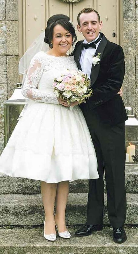 The wedding blessing ceremony took place in the Chapel of St. Moling at Borris House, when the bride wore an ivory 1950s-style tea-length dress by Ellis Bridals with long lace sleeves and a keyhole back.