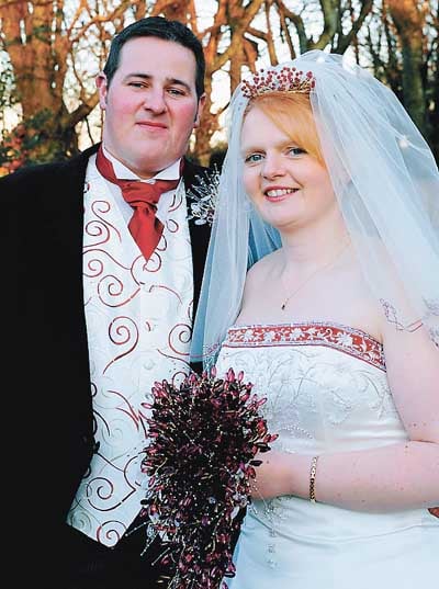 Given away by her uncle Mr. John Henderson, the bride wore an ivory luster satin dress with pearl and crystal beading and semi-cathedral train, with the train inset and bodice band in claret, and carried a bouquet of claret crystals and pearls.