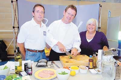 Picture shows celebrity chef Dudley Newberry (centre) at the Fishguard Roadshow with Chris Martin, chairman of the Pembrokeshire Local Health Board and Clr. Sian James.