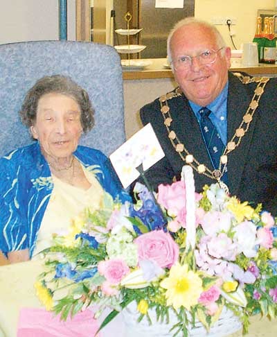 TENBY resident, Mrs. Jessie Gilson, recently celebrated her 102nd birthday with a party at Tenby Day Centre. Mrs. Gilson had numerous visitors throughout the day, including Pembrokeshire County Council vice-chairman, Clr. Arwyn Williams, who presented her with a bouquet of flowers.
