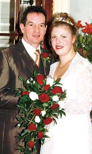 She was attended by her sister, Wendy Louise who wore a red satin full-length dress and flowergirls Bronwen and Megan, the couple's daughters who wore ivory and gold traditional bridesmaid dresses.