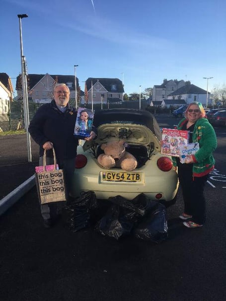 Pictured is Tracy Olin, founder of PATCH, and Rev. John Morgan helping load up the toys purchased by children of Tenby Church in Wales Primary School.