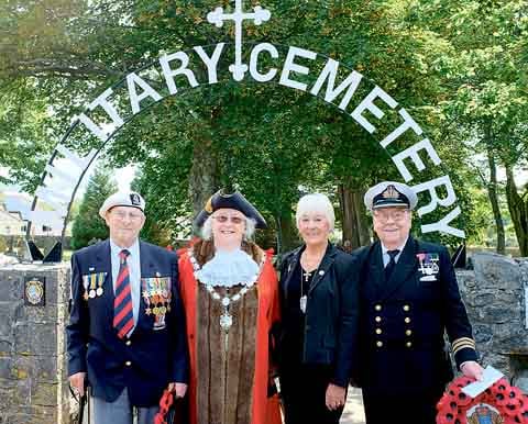 War veteran Gerry Price is seen with Mayor of Pembroke Dock, Clr. Pam George, Deputy Mayor of Pembroke, Clr. Pauline Waters and Commander Tony Mason at the Military Cemetery at Llanion where Monday’s service of remembrance was held.