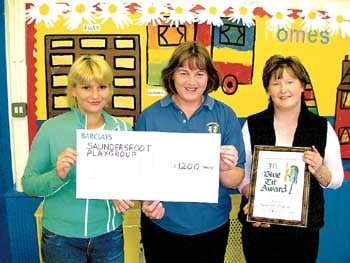 Saundersfoot Playgroup has been given a financial boost thanks to Shauna Rowell, who took part in the village's New Year's Day Swim to raise funds for the group. Shauna from Begelly, works for Barclays Bank in Tenby, who kindly matched the money she raised, which brought the final total to a superb £1,200. Pictured receiving the cheque from Shauna is playgroup assistant Vanessa Rosser and secretary Nicky Prosser.