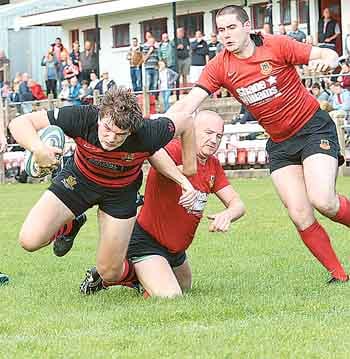 Receiving the kick-off, Tenby hit straight at the heart of the visitors' pack through a fine catch and run by lock Gareth Edwards, supported by flankers Jason Ronowitz and Roy Osborn. With the United eight all fired up, the ball was quickly recycled and in the hands of scrum-half Will Crockford, who spun it wide to number 10 Lloyd Thomas. Even with the Amman back line up on them quickly, the Tenby backs made good distance into the visitors' 22 after Thomas brought the hard and direct running centre Mark Heywood down the middle. He was able to make the hard yards and take out two would-be defenders, before slipping the ball to Dan Colley, who also made yards and unleashed speedy winger Simon Stanford down the touchline. It looked like Stanford would score, but a last-ditch tackle by his opposite number brought him down just short of the line.